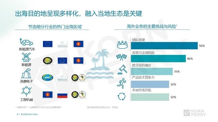 企业出海过程中面临的三大主要挑战是:团队搭建、政策与法律风险及跨文化融合。