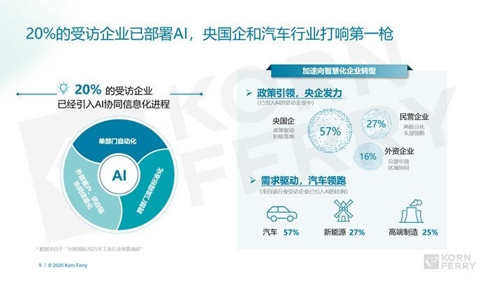 调研显示,已有20%的受访企业引入AI加速智慧化转型,其中央企和国企成为转型的主力军,依托政策驱动,积极推动AI技术的应用与落地。
