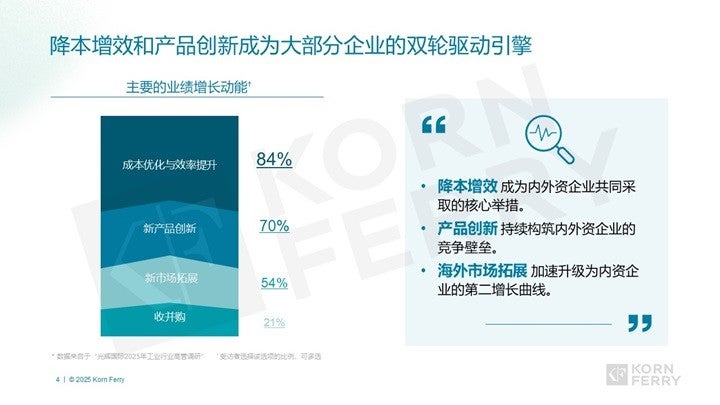 尽管降本增效仍是内外资企业都看重的重要管理举措,通过产品创新来为组织构筑竞争壁垒也是工业企业的共同重点。