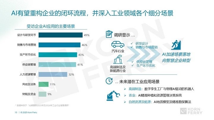 汽车行业正加速在研发设计以及销售与市场营销环节推进AI场景落地;而高端制造和新能源行业的受访企业则表示,他们更倾向于在供应链管理和生产环节引入AI,以提升整体生产效能。