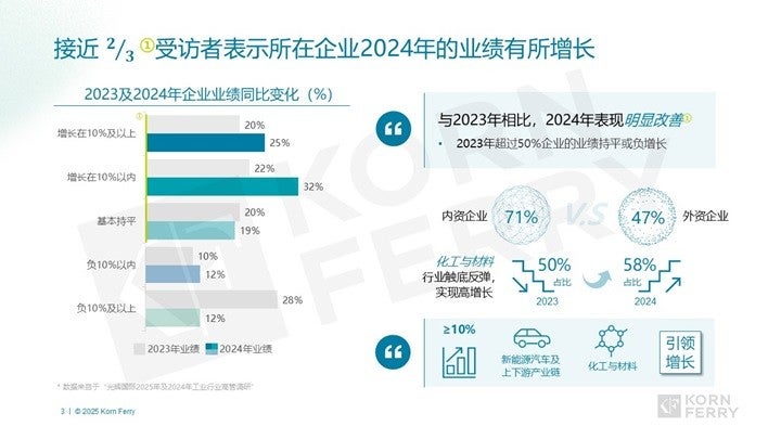 相较于2023年调研中,超过一半的受访者表示业绩持平或负增长;今年受访高管普遍表示整体业绩表现明显回暖。
