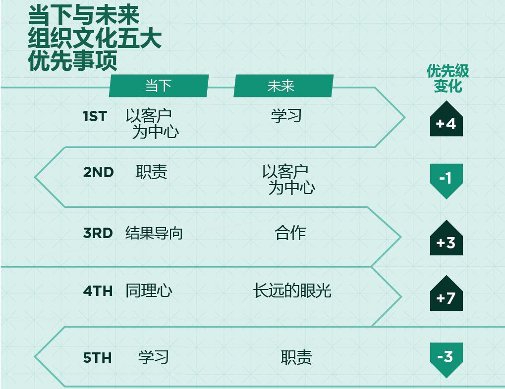 我们的研究还列出了,在当下与在未来的发展环境中,塑造组织文化需要关注的优先事项排序变化。
